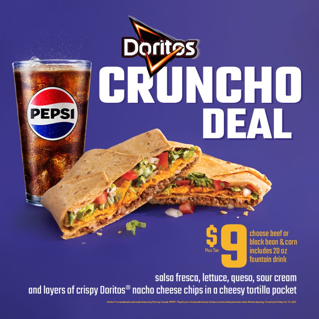 If you love El Cruncho, try the new $9 Doritos® Cruncho Deal. You get a beef or veggie Cruncho stuffed with fresh toppings, melty queso, and a crispy layer of Doritos® Nacho Cheese chips. Plus, a medium fountain drink!