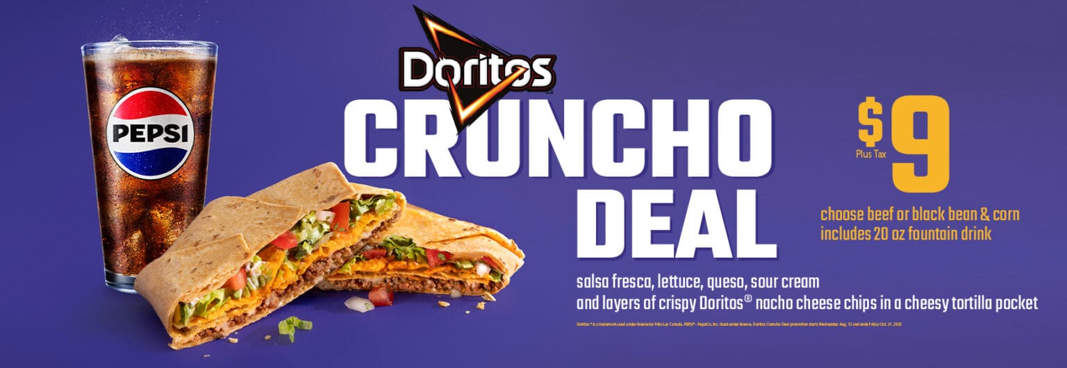 If you love El Cruncho, try the new $9 Doritos® Cruncho Deal. You get a beef or veggie Cruncho stuffed with fresh toppings, melty queso, and a crispy layer of Doritos® Nacho Cheese chips. Plus, a medium fountain drink!