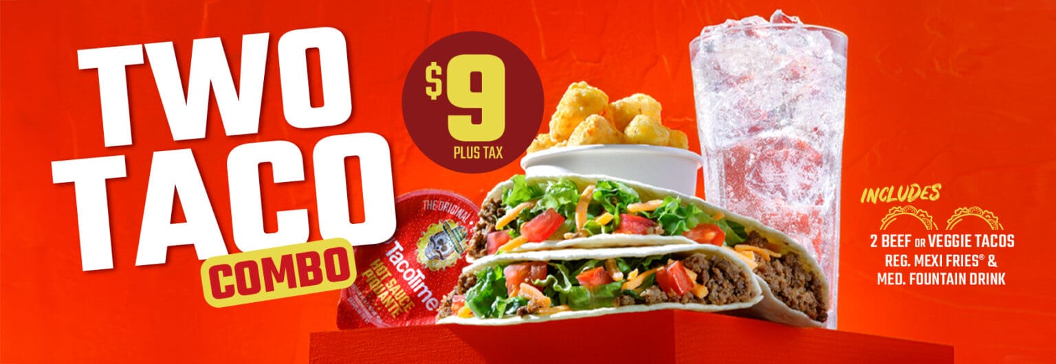 For a limited time, enjoy two beef or veggie tacos, regular Mexi-Fries®, and a fountain drink for a great price.