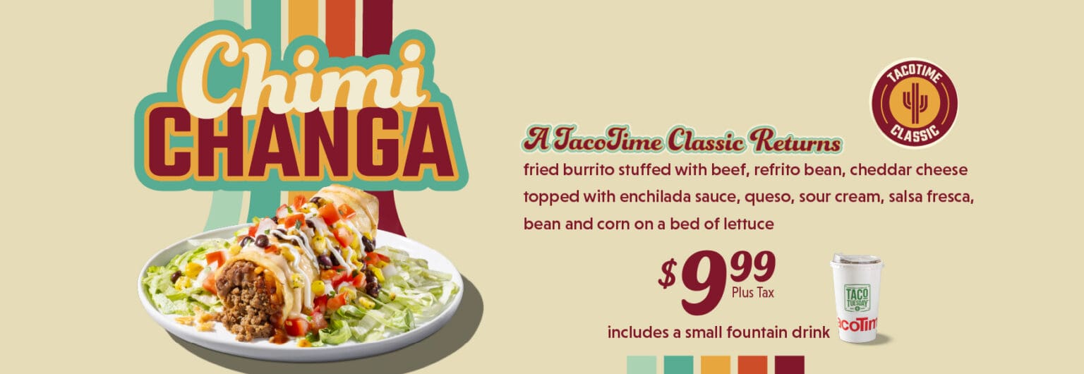 The legendary deep-fried burrito is back after many years! The ultimate comfort meal, stuffed and topped just the way you remember. Try this blast from the past, including a small fountain drink, for only $9.99!