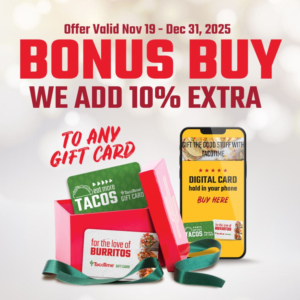 Get a 10% bonus on digital or physical TacoTime gift cards when you buy $5 or more online or in-store.