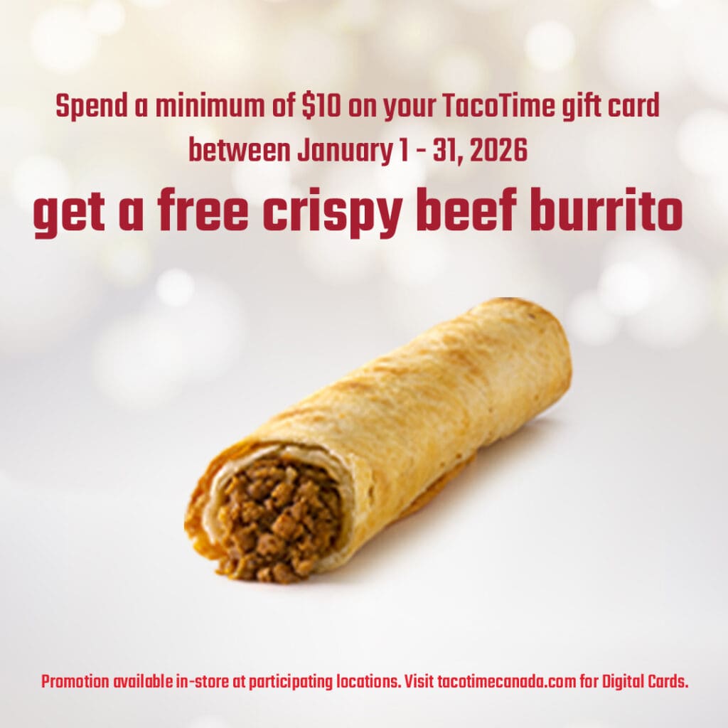 Kickstart January with a free Crispy Beef Burrito when you spend a minimum of $10 on your gift card. Available in-store only.