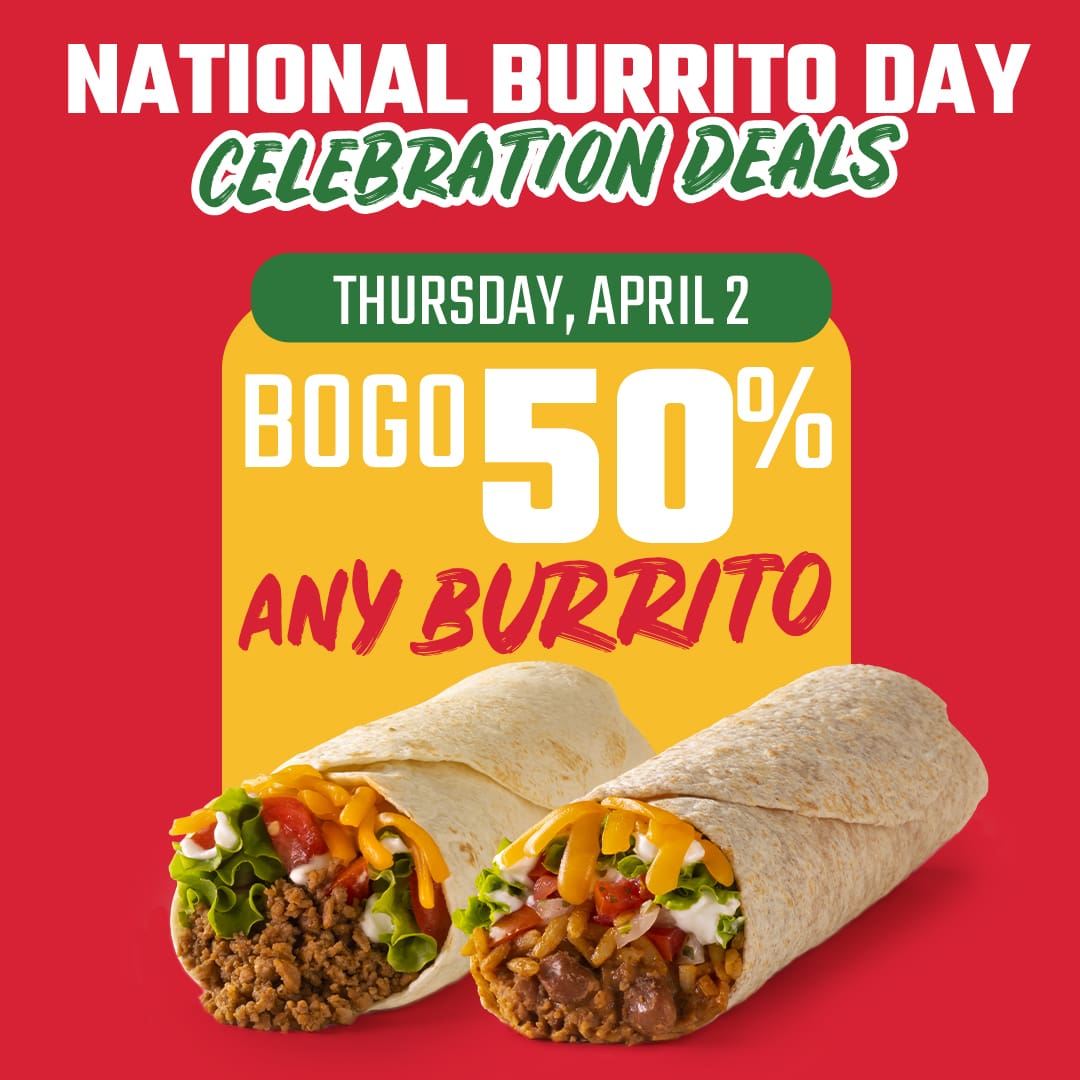 🗓️Thu, April 2: BOGO 50% Off Any Burrito 🌯