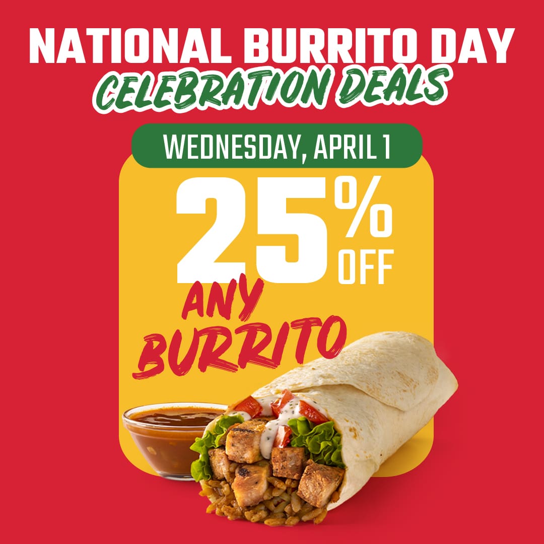 🗓️Wed, April 1: 25% Off Any Burrito 🌯