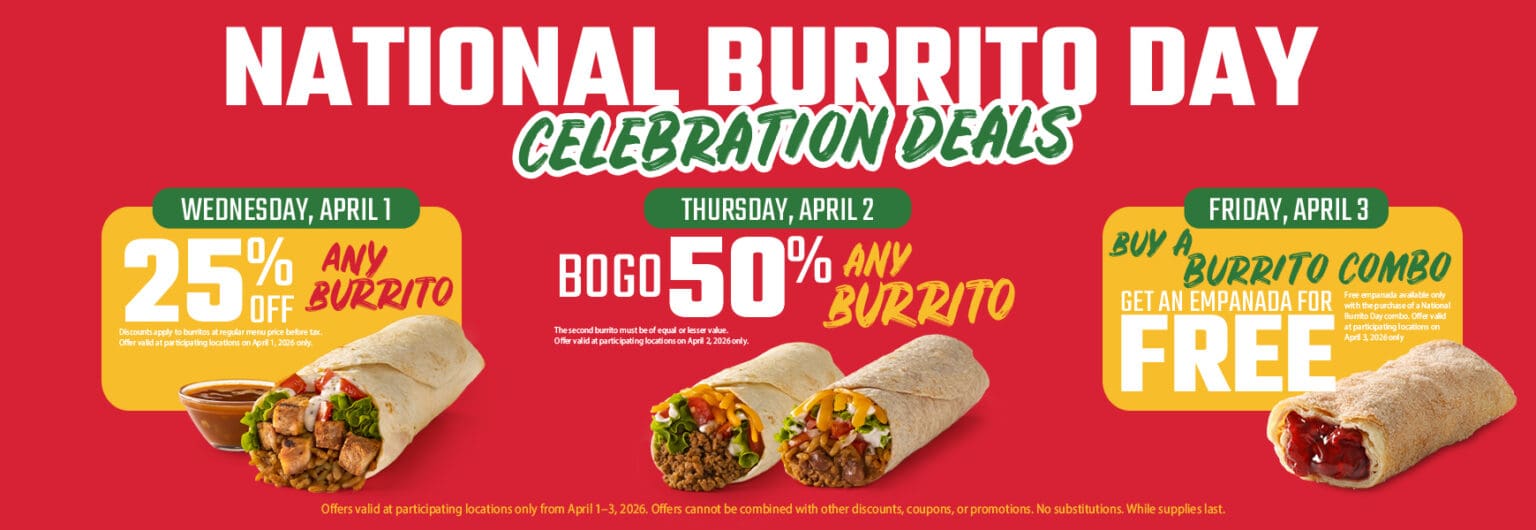 On Day #1 of National Burrito Day deals, get 25% OFF any burrito. Order in-store, online, or through the TacoTime app. Valid at participating locations only on April 1, 2026. Cannot be combined with other offers.