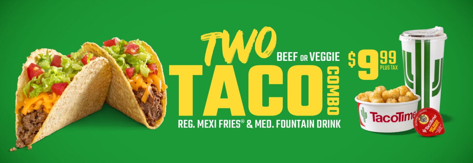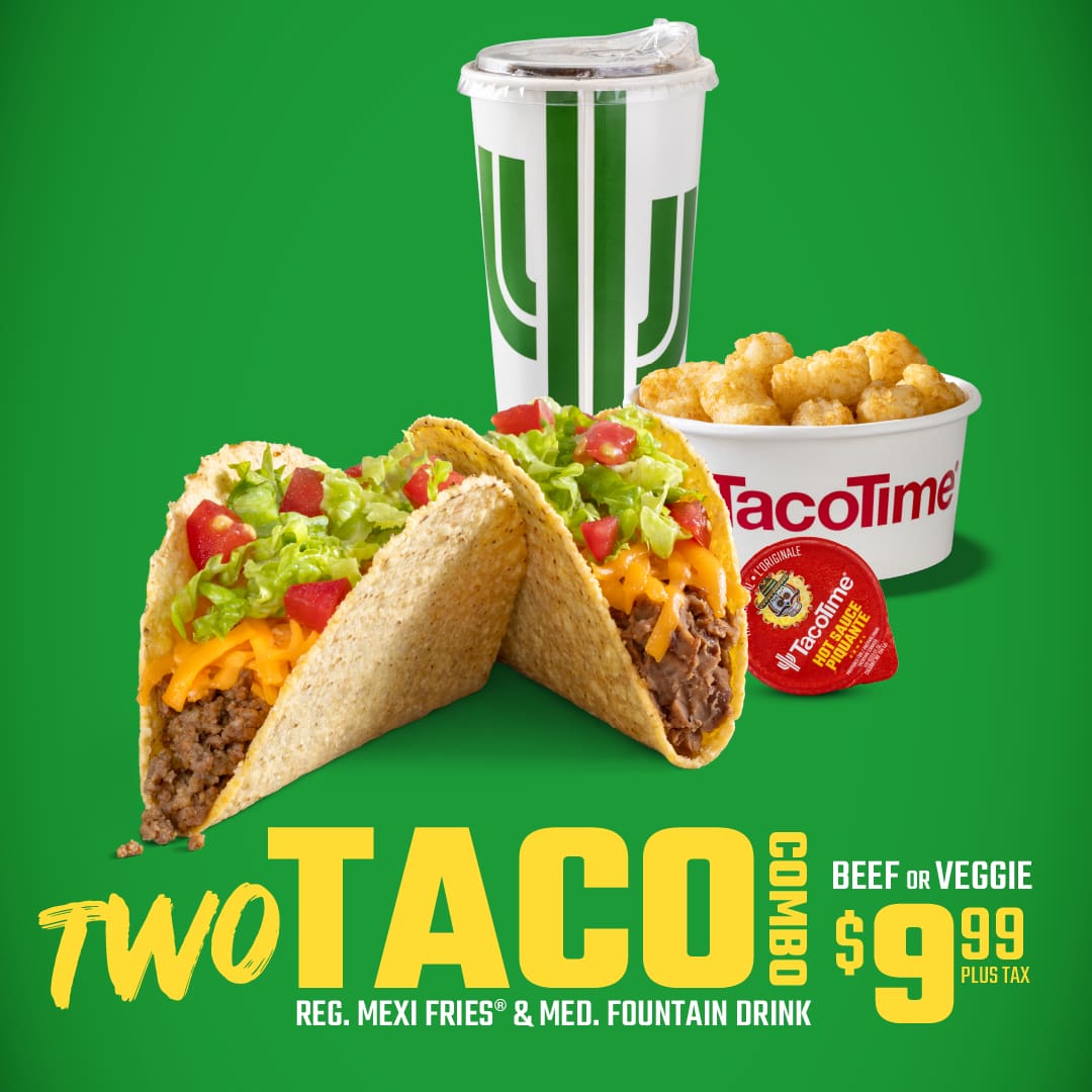For a limited time, grab a Crisp beef burrito, regular Mexi-Fries®, and a medium fountain drink, all for $9 plus tax, when you dine in or take it to go. Want it delivered? Order on the TacoTime app or through Skip, DoorDash, or Uber Eats for only $11 and get a bottled beverage instead.