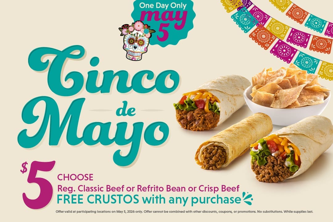 Classic Beef, Refrito Bean, or Crisp Beef burritos for just $5