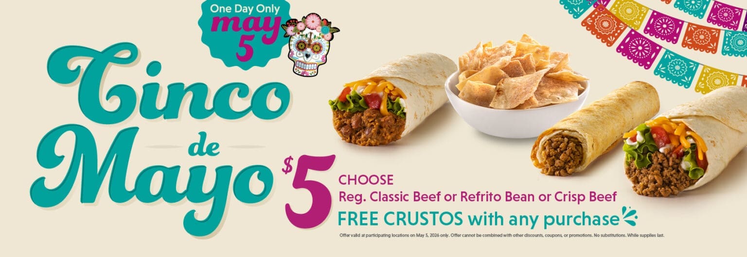 🌯Classic Beef, Refrito Bean, or Crisp Beef burritos for just $5